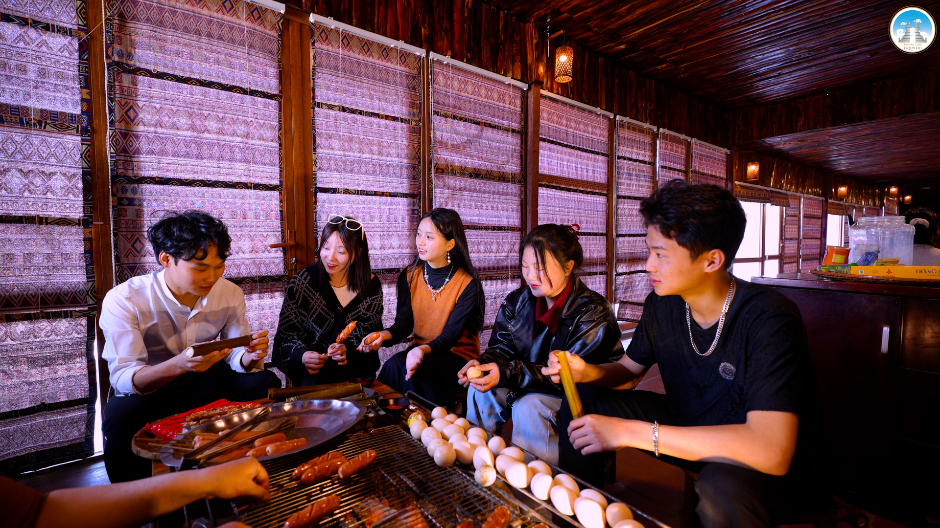 🥚 Bên bếp than hồng, du khách có thể tự tay nướng trứng, xúc xích, cơm lam, vừa trò chuyện vừa tận hưởng hương vị nồng nàn của núi rừng trong không gian nhà sàn truyền thống phủ đầy thổ cẩm.
